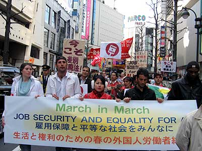 その後、渋谷の「マーチ・イン・マーチ 生活と権利のための春の外国人労働者総行動」に急いで向かった。最初から参加してた友人の話によると、前段集会もスピーチやパフォーマンスでかなり盛り上がってたらしい。僕が宮下公園に到着して程なく偶然にムスタファ・ファミリーのアピールがあり、その後間もなく、渋谷一周デモに出発した。外国人が主体のデモでダサいのって見たことない。日本人の運動圏ももっとグッとくるデモを企画しろ。かめよん。からのお願いでした。 |